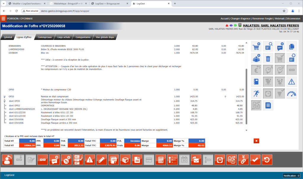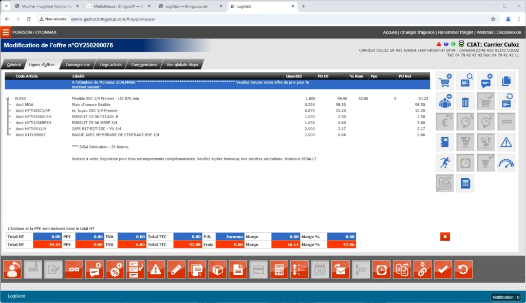 - Toutes les informations relatives au client à tous les niveaux de l’activité (prospection, visites, offres, informations administratives, commandes, encours, préparations, livraisons, facturations, CA) sont affichées sur la fiche client GRC afin d’avoir une vision globale de l’activité avec celui-ci